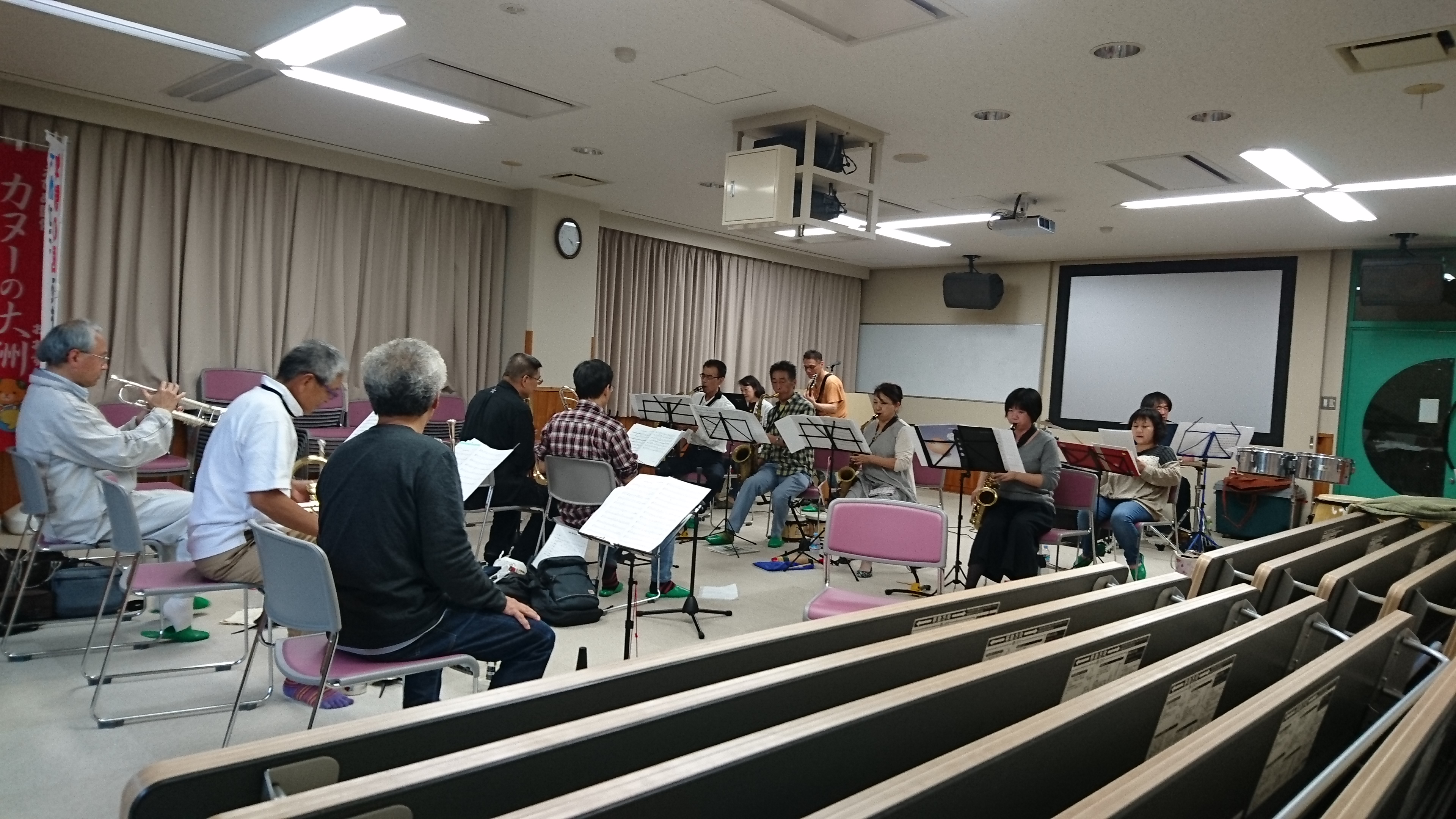 今回は、サックス隊がパーカッション隊に変身する曲がありますが、全員顔が渋くなるらしいです。